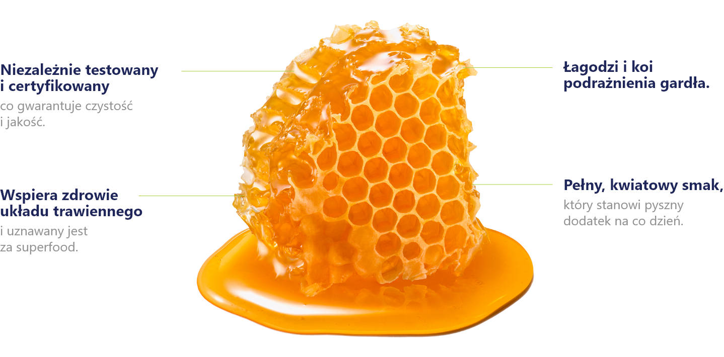 ✓ Miód najlepiej przechowywać w kuchennej szafce lub spiżarni, z dala od bezpośredniego światła słonecznego. Nie przechowywać w lodówce ani w pobliżu źródeł ciepła.