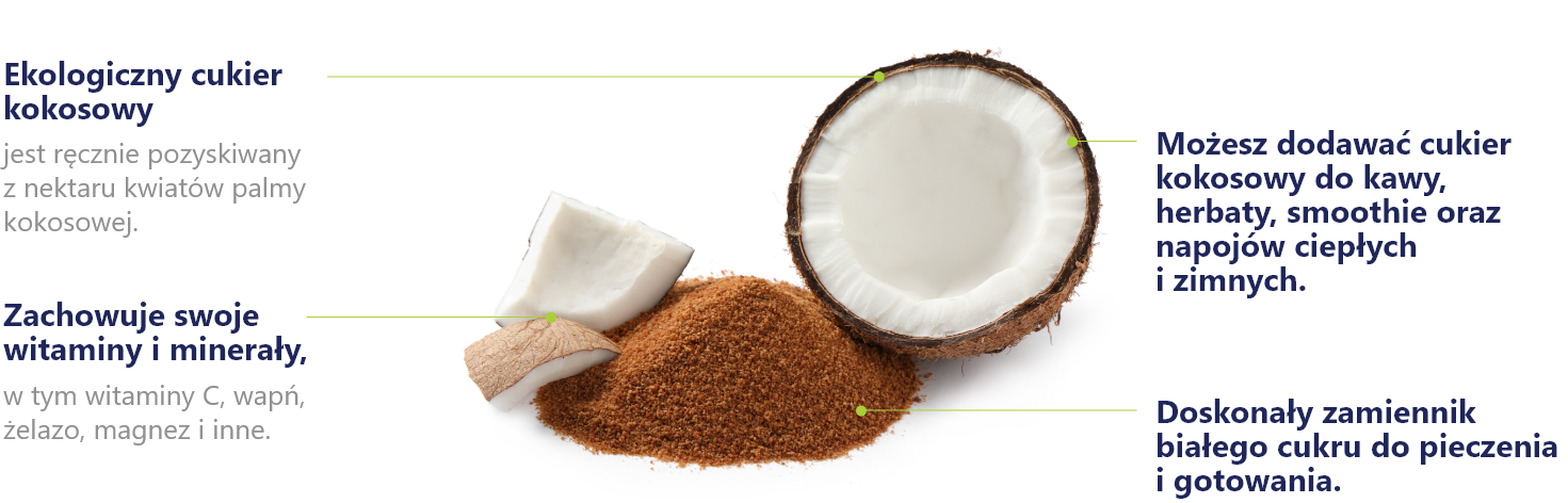 ✓ Najlepiej przechowywać w kuchennej szafce lub spiżarni, z dala od bezpośredniego światła słonecznego. Nie przechowywać organicznego cukru kokosowego w miejscach narażonych na bezpośrednie działanie ciepła.
